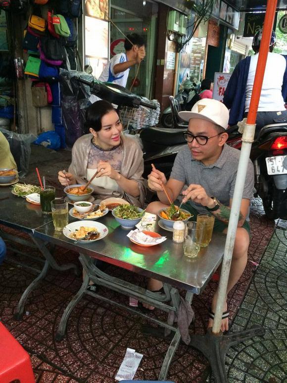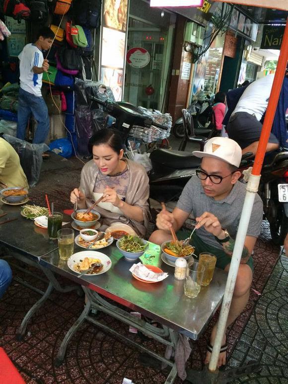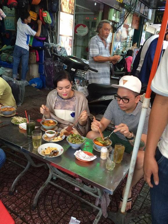 Người đẹp vui vẻ trò chuyện trong khi thưởng thức món bún riêu